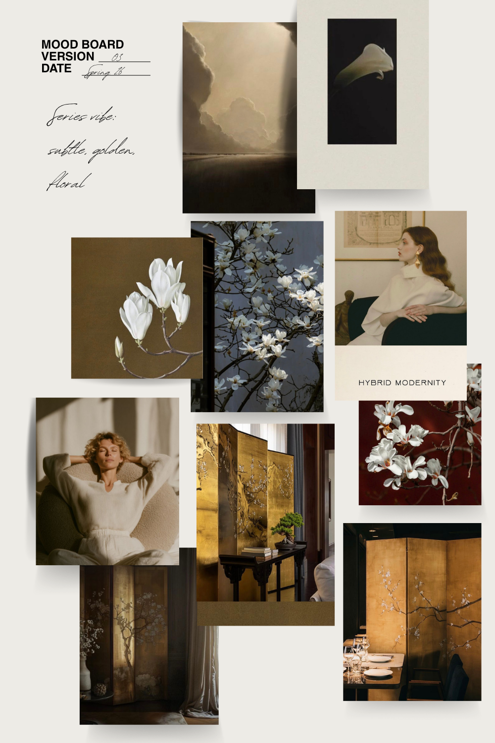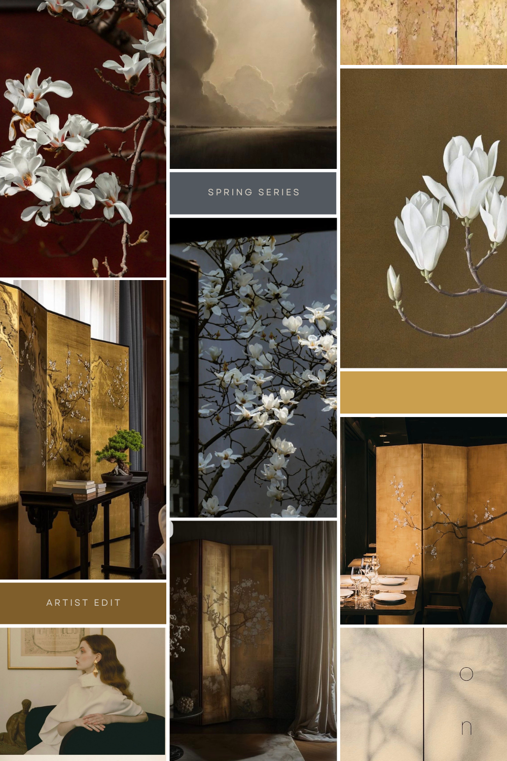 NOTE: These are screenshots from the past couple weeks. Currently obsessed with gold, florals, byobu, shadows, and black on cream.THREE
